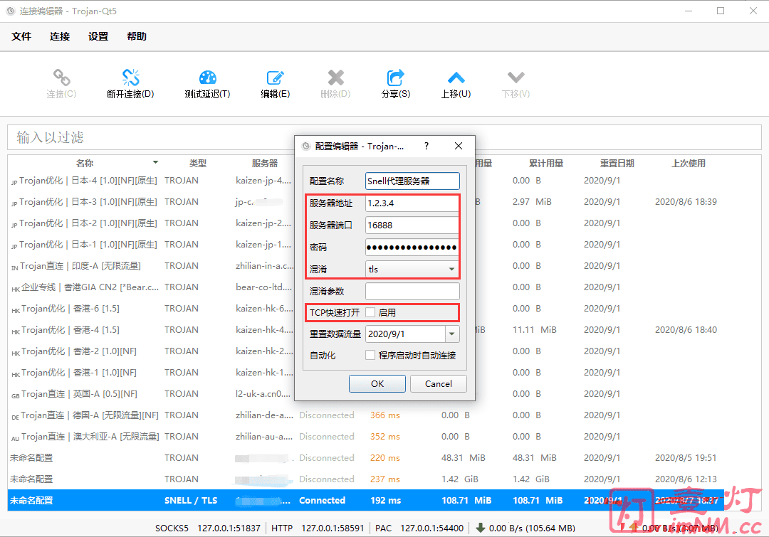 目前,支持Snell协议的常用客户端有 Trojan-Qt5、Clash、Shadowrocket 和 Surge,其中 Trojan-Qt5 只支持Windows/MacOS/Linux,Clash客户端支持Windows/MacOS/Linux/Android/网关路由器等平台(不支持iOS系统),安卓端使用 Clash for Android,苹果iOS端使用 Shadowrocket 或 Surge for iOS,Mac端也可以使用 surge for Mac 。
