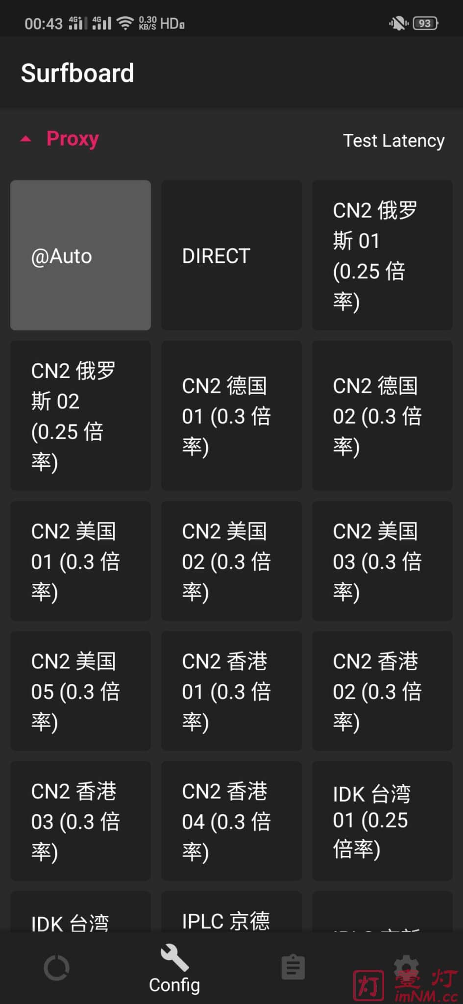 一般Surfboard配置文件中默认有“@Auto”自动策略,若在“Proxy”代理策略组中选中“@Auto”自动的话,那么每隔一段时间,软件将进行延迟测试并自动切换到延迟最低的节点,实现负载均衡,使用体验会大大提高。如下图所示: