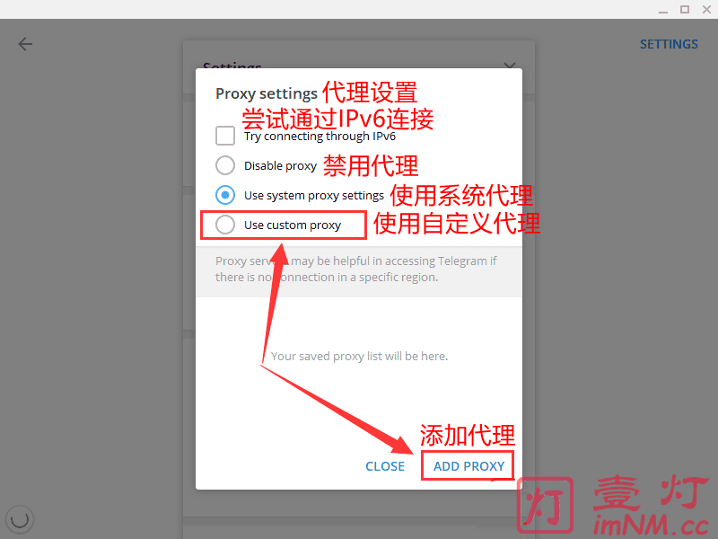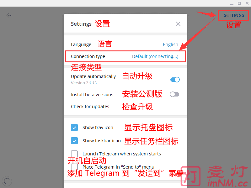 我们都知道,Telegram 在中国大陆地区是无法访问的,所以在登录之前我们必须设置好科学上网代理。由于手机端代理一般都是全局模式,无需进行特别设置即可正常使用,但电脑端的很多代理软件并未开启全局模式,需要我们单独设置。首先,打开 Telegram 程序,然后依次点击“START MESSAGING”-右上角的“SETTINGS”按钮,打开“设置”选项,如下图所示: