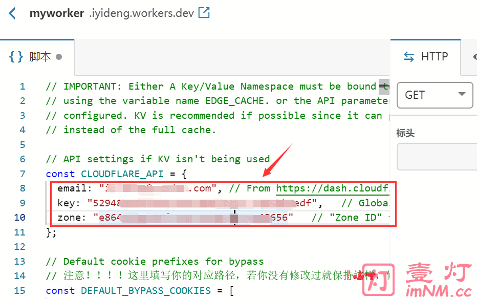 以上添加的 Cloudflare Worker 规则代码需要填写注册 Cloudflare 账户的电子邮件地址(email)、“区域 ID (key)”和“全局 API (zone)”。如下图所示: