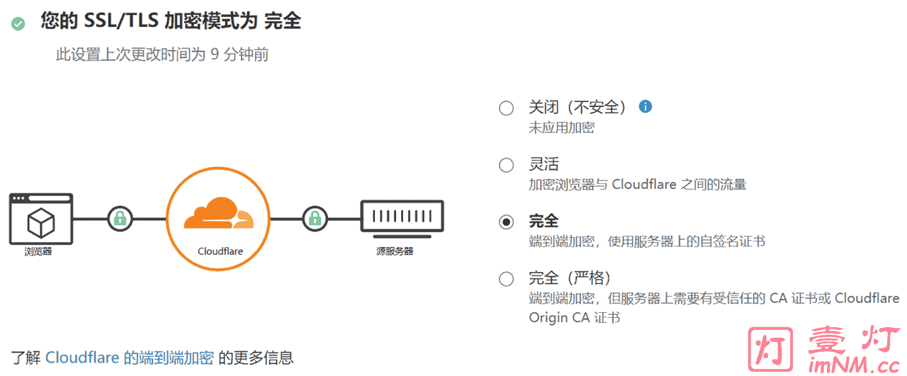 我使用以上3种方法尝试均失败,而且我思考尽然问题处在HTTPS重定向上,那么会不会是其他环节有问题呢?我经过再三思考,我判断可能出现在 CDN 上。于是,我登录 Cloudflare 的后台,把“SSL/TLS” 加密模式由默认的“灵活(Flexible)”改为“完全(full)”,然后问题得到完美解决。如下图所示: